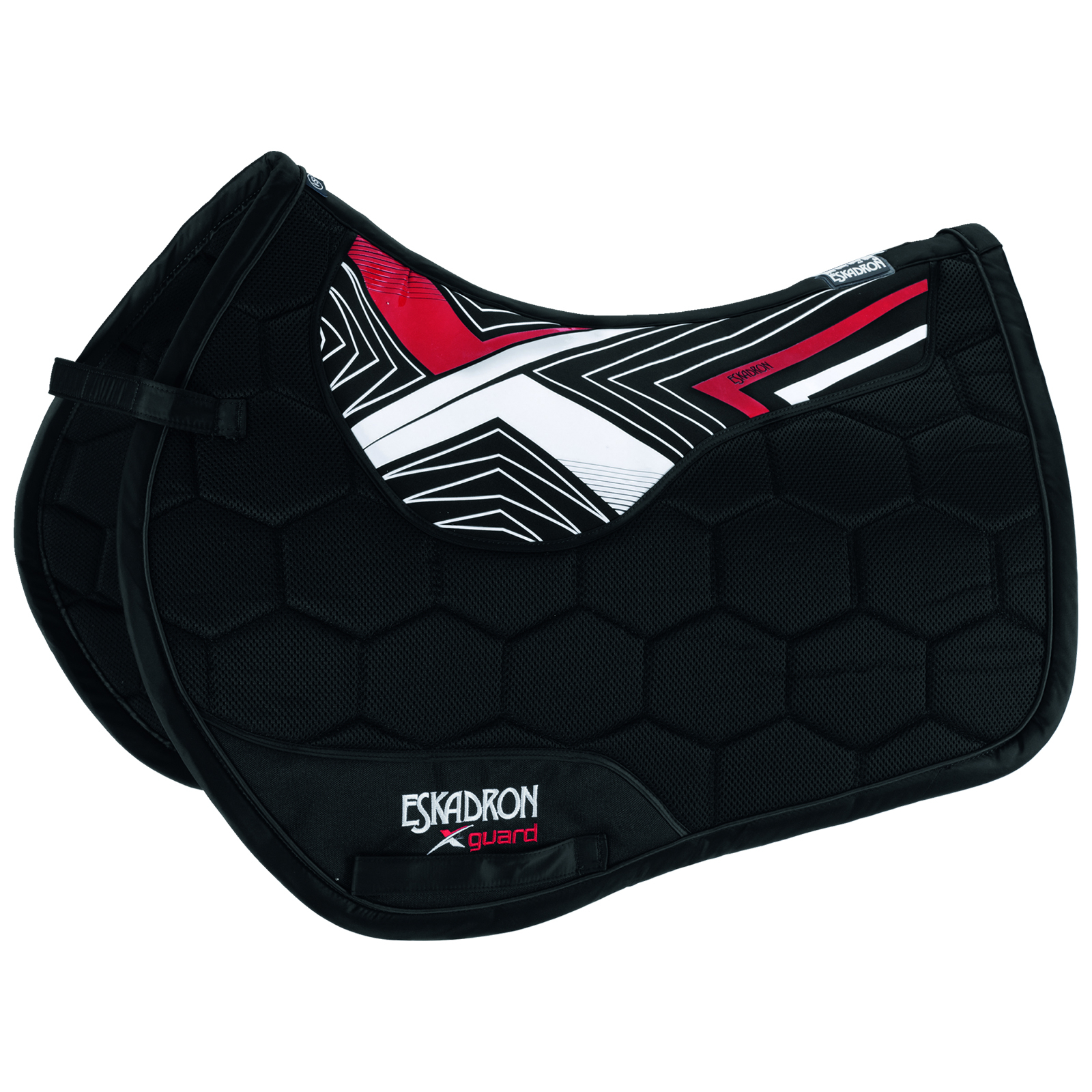 Brandnew saddle cloth with maximum breathability in special cut. The three-dimensional air condition spacer fabric is compactly quilted and improves pressure distribution and air circulation. Silicone surfaces in the saddle area are shock absorbing and anti-slip. RUB-PROTECTION surfaces in the saddle girth area on both sides protect against rubbing. Especially in warm months these special cuts are popular due to their small contact area. It is enough space forpossible embroidery or start numbers.