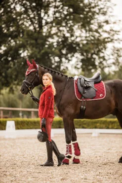 Our Horze Geneva saddle pad is made from soft velvet material, and equipped with functional quick-dry lining. Faux fur, luxurious quilting and double cord piping look stunning. The protective boot area prevents scratches. Also available as all purpose version. Pair it with our matching Horze Geneva ear net.