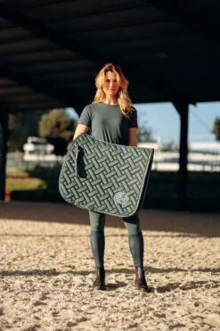 Our Horze Oslo saddle pad is made with breathable lining that keeps your horse cool in summer, and equipped with crossover quilting that adds an interesting look. Bright colours bring fun to your tack. Hook-and-loop and webbing straps keep this saddle pad in place. Pair it with our Horze Olso brushing boots and ear net for a full outfit.