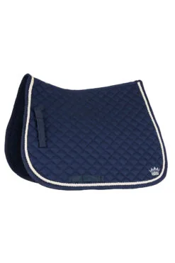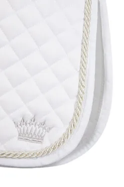 Strong, sturdy silver cord surrounds the border of this attractive all purpose saddle pad. The beautiful diamond quilt pattern, ergonomic shape and impeccable attention to detail set this pad apart from the others. This pad acts as a protective barrier between the saddle and horse’s back. This pad is luxuriously soft with breathable cotton lining to wick away moisture from his back for cool comfort. The contoured pad follows the horse’s natural shape to eliminate rubbing and friction adding extra relief around the withers for enhanced comfort. A silver embroidered crown sits on the bottom corner to match the silver cord trim. Your horse will be the envy of the barn wearing this sharp saddle pad! It will look custom with your name or initials embroidered on it!